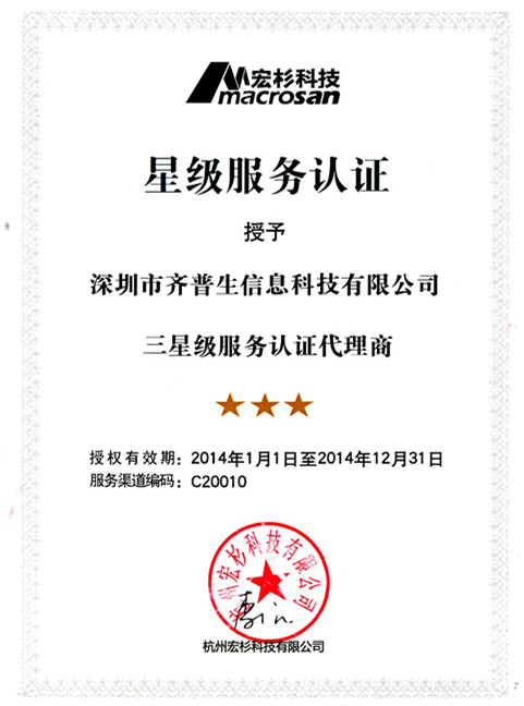 2013年12月,齊普生公司再傳喜訊:榮獲杭州宏杉科技有限公司(以下簡稱:宏杉科技)三星級(jí)服務(wù)認(rèn)證代理商資格證書!